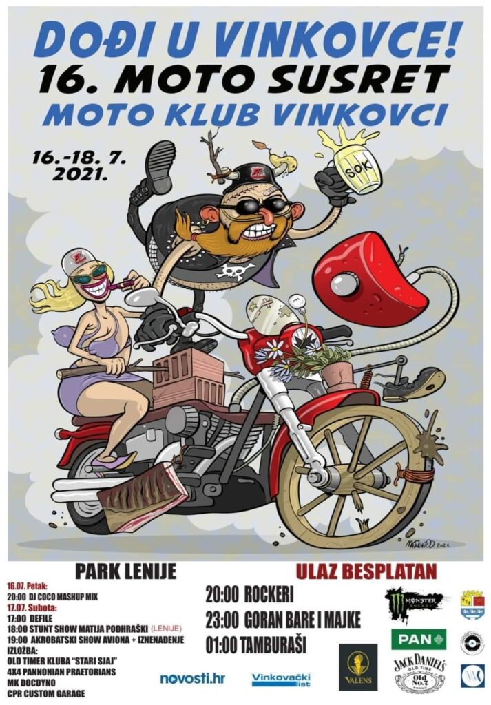 Pregršt događanja od 16. do 18. srpnja izmamit će zasigurno sve ljude van, a i dovesti brojne posjetitelje u Vinkovce – 16. MOTO SUSRET „DOĐI U VINKOVCE“ održat će se u Lenijama s planiranim koncertom 17. srpnja Gorana Bareta i Majki.