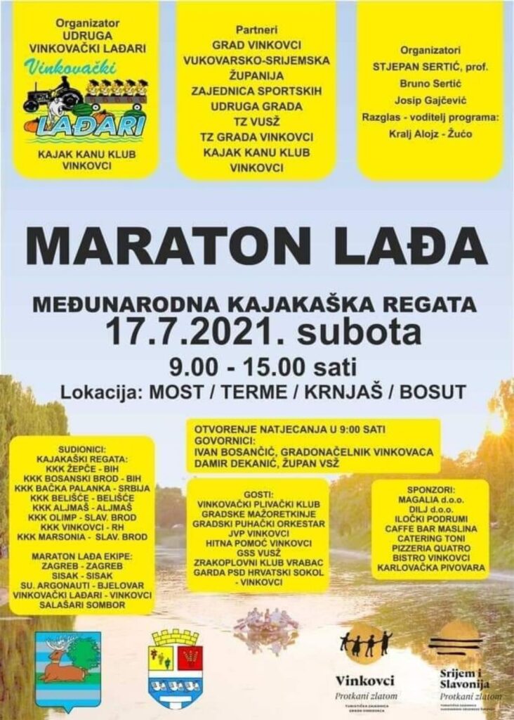 Isti dan održat će se i Međunarodna kajakaška regata na Bosutu, a predviđeno vrijeme trajanja je od 9 do 15 sati. Navečer, od 20.30 sati možete uživati u predstavi na vinkovačkom korzu OCAT I SIN (ZLATAN ZUHRIĆ ZUHRA I TIN SEDLAR) ili u nastupu TS Ringišpil u Marabu baru Vinkovci.